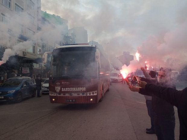 Kendi sahasında Balıkesirspor’u 1-0 yenen Bandırmaspor futbolcularını taşıyan otobüsü taraftarlar meşaleler ile karşıladı.